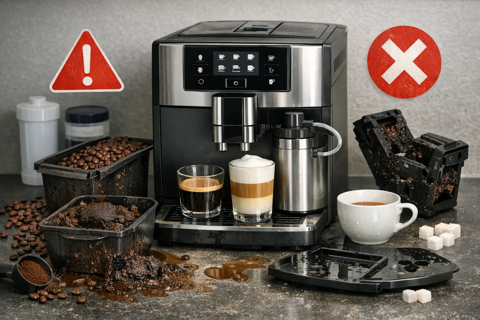 Verstopfungsrisiko: Ölige oder aromatisierte Bohnen können das Mahlwerk zusetzen. Reinige Mahlwerk und Bohnenbehälter regelmäßig. Hygiene: Unmittelbares Spülen des Milchsystems ist Pflicht. Sonst entstehen Bakterien und schlechte Gerüche. Überlastung: Bei vielen aufeinanderfolgenden Bezügen kann das Mahlwerk warm laufen. Lass die Maschine kurz abkühlen, um Schäden zu vermeiden.